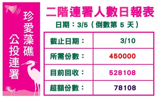 目前,藻礁公投連署總部已開始投入大量人力分類造冊,以趕在3月15日將連署書送到中選會審核,期在今年8月舉行公投。而在連署書將送達中選會審核的3月6、7日週末假日,邀請民眾穿上粉紅或桃紅色的衣服,也可以別上粉紅飾品,大家來展現對藻礁守護的決心。