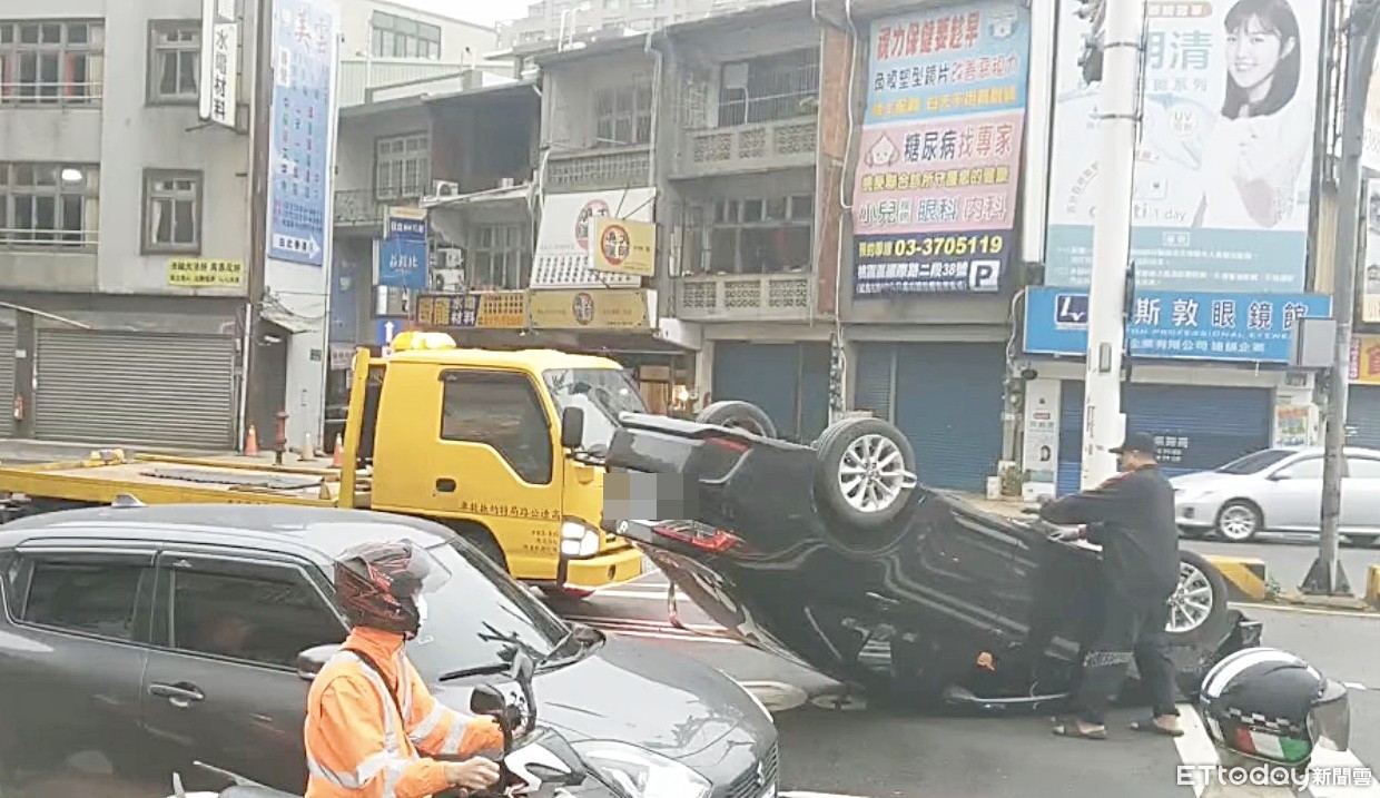 ▲桃園市游姓男子6日清晨5時許開車行經桃園區國際路時,失控撞上前方待轉轎車翻覆,經警方到場酒測為每公升0.2毫克。(圖/記者沈繼昌翻攝)