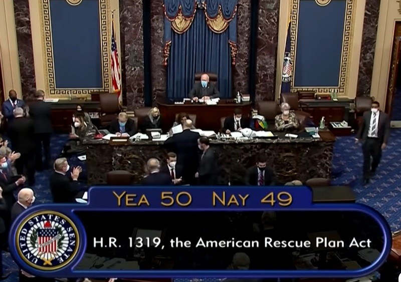 此次投票結果為50票贊成,49票反對,通過修正版紓困法案,並會交回眾院投票,若通過即可呈交總統拜登簽署生效。兩黨勢均力敵的參議院在此次投票中,贊成的50票均為民主黨,反對的49票則都是共和黨,唯獨阿拉斯加州的參議員蘇利文(Dan Sullivan)因「家中發生緊急事件」缺席投票,因而讓議程通過,否則民主黨籍副總統賀錦麗(Kalama Harris)就必須前往參議院投票,根據美國法律規定,副總統兼任參議院議長。