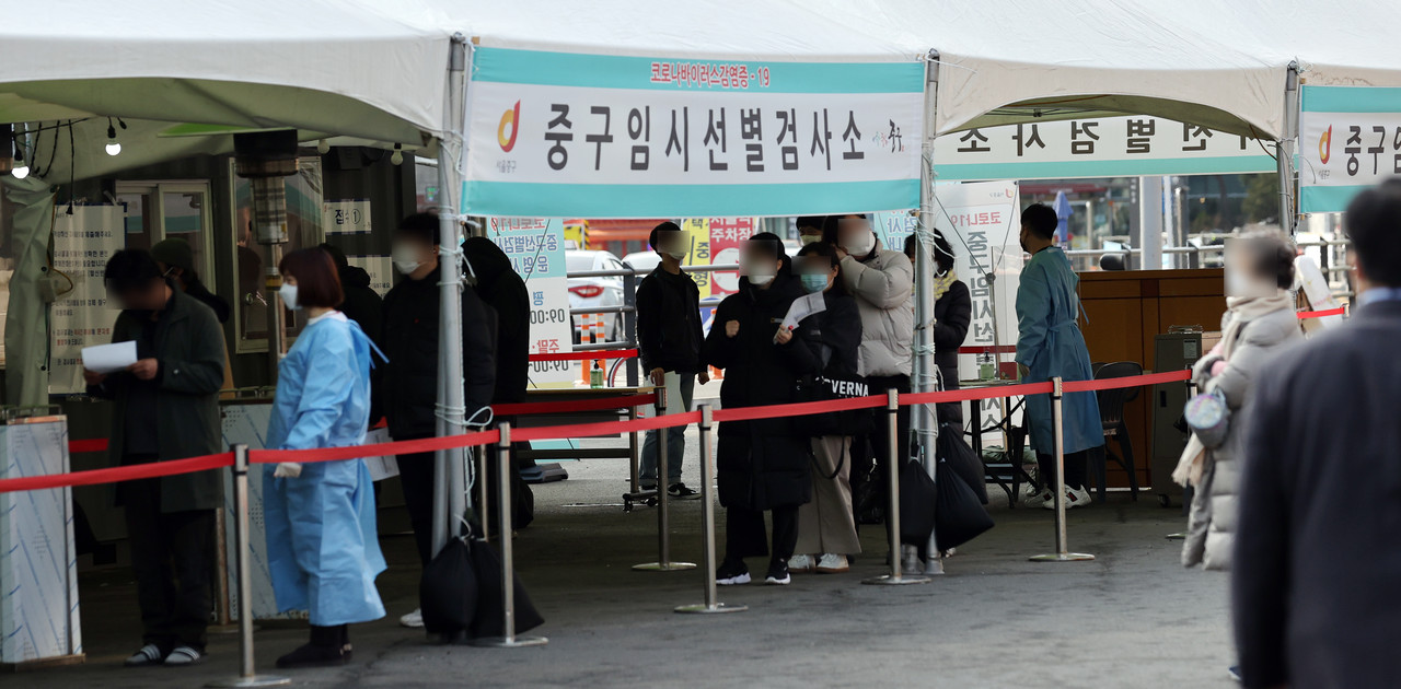 ▲南韓近期單日新增病例維持3、400多人,圖為首爾中區臨時篩檢站。(圖/達志影像)