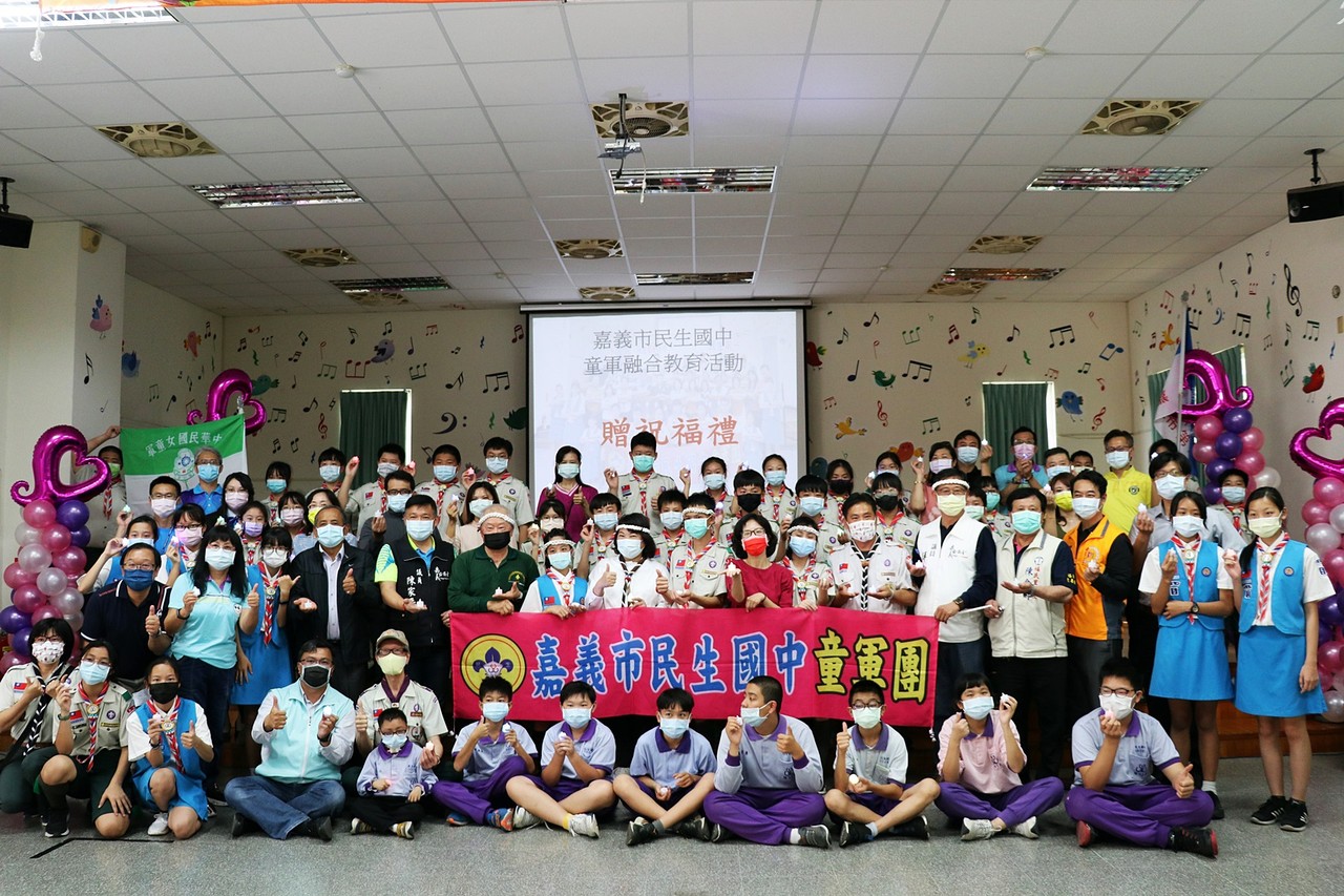 嘉市民生國中童軍團全團共計82名團員,童軍團團長許碧珠帶領下,109學年度獲得教育部全國績優童軍團殊榮。今年更由嘉義社區發展教育事務基金會李錫津董事長指導,將融合教育導入童軍團,達到團內「人人能服務」目標,今年更有3位特教孩子通過融合活動榮譽團考驗並參與正式入團儀式。