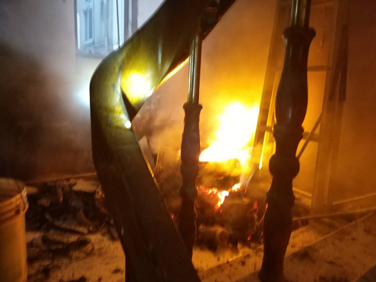 消防員滅火後表示,門會打不開,應是當時火勢燃燒高溫使得門出現熱膨現象,讓門不易開啟,該門並無上鎖情形,胡男聽到聲響應是燒到壓縮氣體罐物品所發出,且樓梯間堆放的雜物是胡男所有。