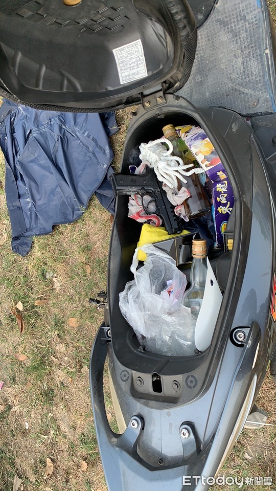 ▲高雄槍擊案,犯嫌逮捕到案,警方在車廂內起獲槍枝以及童軍繩。(圖/記者許宥孺翻攝)