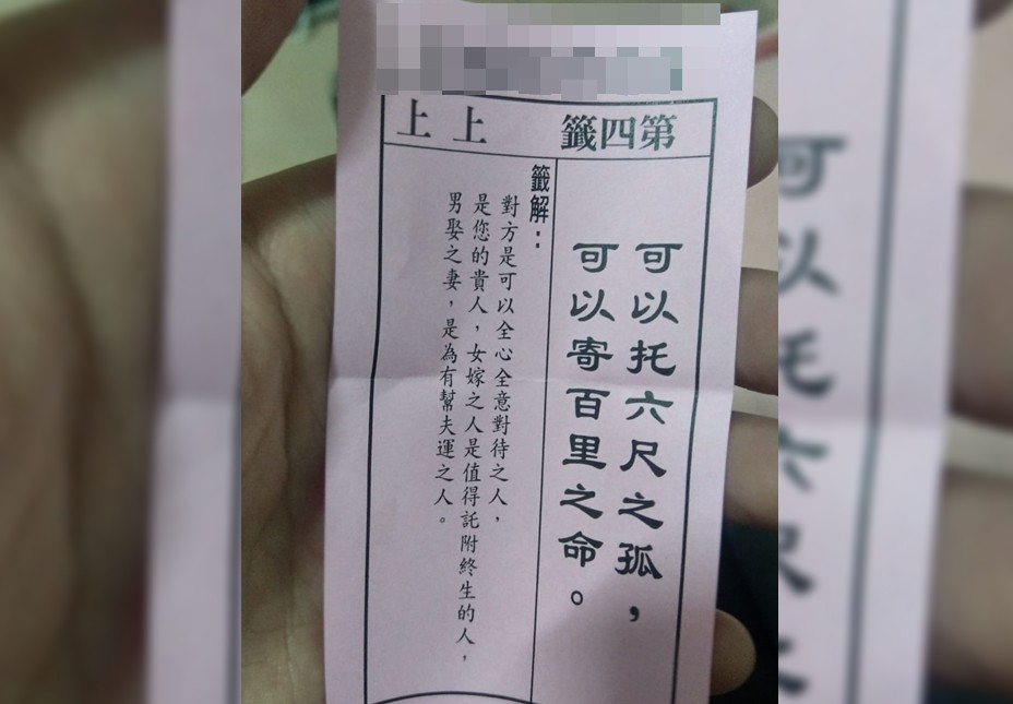 「月老呀月老~ 我在這呀!」一名男網友表示,他日前到廟中拜月老時抽到「上上籤」,但滿心歡喜的他沒有脫單,反而是身邊的異性好友接連找到對象,只剩他孤單一人。有網友細看詩籤,發現詩籤上兩字才是造成原PO單身至今的原因。