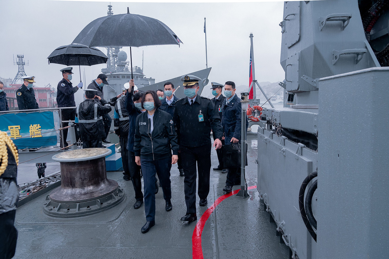 面對共軍頻繁擾台,駐防基隆的海軍131艦隊負責偵監任務,總統蔡英文8日特別前往視導蘭陽軍艦,並且冒雨登艦,要求國軍官兵持續提升三軍聯合作戰能量,拓展全民國防,達成重層嚇阻的戰略目標。