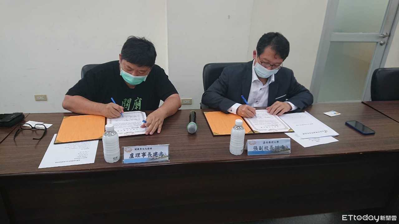▲嘉南藥理大學9日與關廟青文化協會簽署合作備忘錄,由嘉藥副校長張翊峰及關廟青理事長盧建志代表簽署。(圖/記者林悅翻攝,下同)