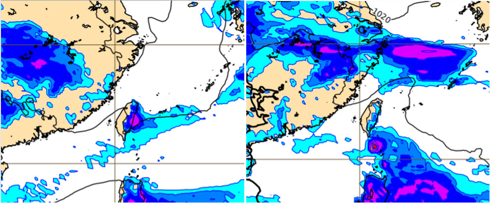 ▲最新(10日20時)歐洲中期預報中心(ECMWF)模式,模擬週六(13日)8時前12小時累積雨量圖(左圖)顯示,降雨主要在東北季風迎風面,背風面幾無降雨。模擬下週三(17日)20時前12小時累積雨量圖(右圖)亦顯示,降雨有類似的分布。(圖/翻攝三立準氣象· 老大洩天機)