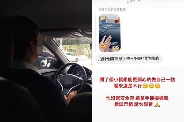 男網友在Dcard上,以「請問自首了嗎」為題發文,從他貼出的截圖畫面可見,啾啾在個人小帳PO出大塞車、「在高鐵站等半小時」的限動;只是該限動一出,就有粉絲好心提醒,「拍到他開車滑手機不好吧?很危險!」啾啾當時則是將對話截圖再PO限動,無奈表示「開了個小帳想能更開心的做自己一點,看來還是不行。他(駕駛)沒繫安全帶,還拿手機要導航,錯誤示範,請勿學習。」