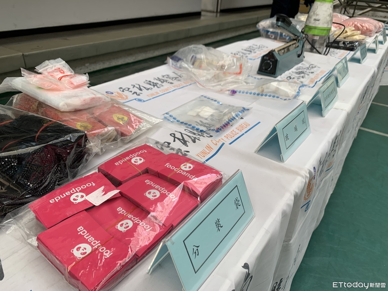 ▲雲林警方破獲毒咖啡分裝工廠,除查扣大量毒品及包裝器具,更驚見毒品分裝袋為「粉紅熊貓foodpanda」。(圖/記者蔡佩旻攝)