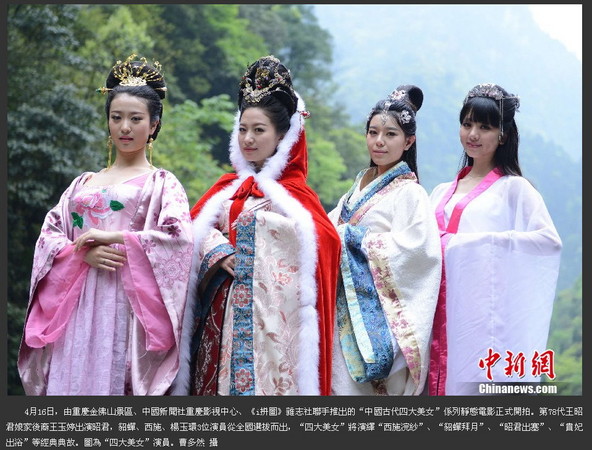 重慶金佛山風景區推出的《中國古代四大美女》靜態電影,16日正式開拍,出演四大美女的現代正妹穿起古裝露面,西施、王昭君、貂蟬、楊玉環(楊貴妃)一字排開,其中,飾演王昭君的正是她的第78代後裔王玉婷。