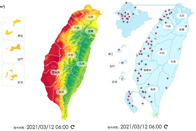 環保署空氣品質監測網資料表示,今天西半部位於背風側,風速較弱有局部霧發生,水平及垂直擴散條件差,汙染物易累積;午後東北季風增強,竹苗以北擴散條件好轉,中南部地區位於下風處,擴散條件稍差,汙染物易累積;高屏地區午後受光化作用影響,臭氧濃度易上升。