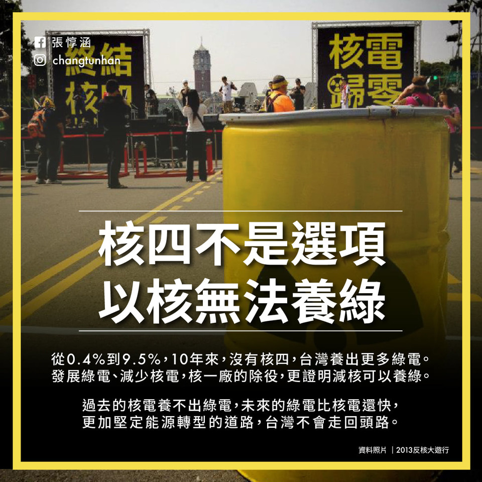 ▲張惇涵表示,核四不是選項,以核無法養綠。(圖/翻攝張惇涵臉書)