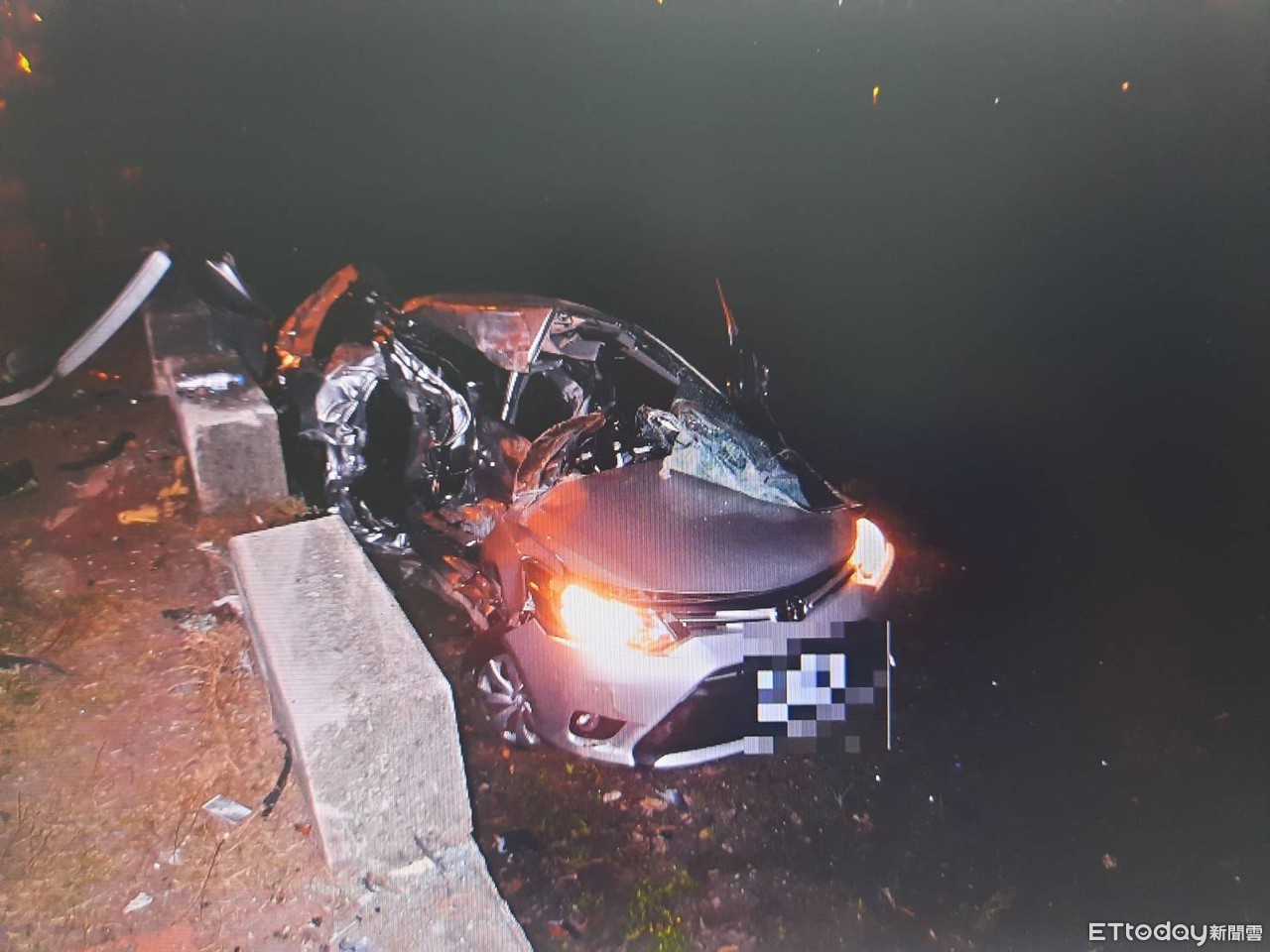 ▲小客車衝入田中,車體嚴重毀損,駕駛命危。(圖/民眾提供)