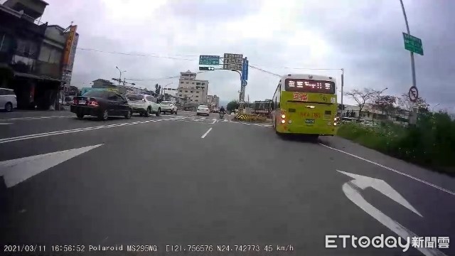 ▲▼空車國光客運宜蘭市中山路一段走右轉專用道後,在縣民大道路口違規左轉中山路一段竟行駛路側。(圖/擷取自《宜蘭知識+》,下同)