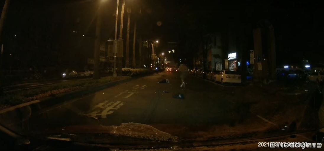 從後方的行車紀錄器畫面看到,張男駕駛的賓士車沿著忠明路高速呼嘯而過,沒多久緊急剎車後,就看到彭女倒地,機車物品散落一地,身穿短褲的彭女男友在路旁看到先是愣住一會兒,隨即衝向前看女友狀況,著急地請路人協助叫救護車、又擔心經過的車輛撞到女友,不斷請經過的車輛要小心。