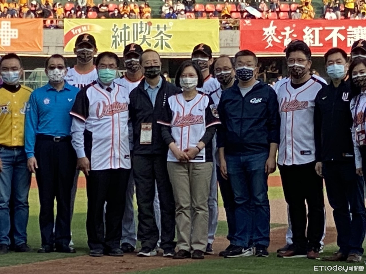 ▲中華職棒開幕戰,總統蔡英文、台南市長黃偉哲等人,與打擊者統一獅吉祥物「萊恩」、國民法官吉祥物「貓頭鷹」擔任主審,完成開球儀式。(圖/記者林悅翻攝,下同)