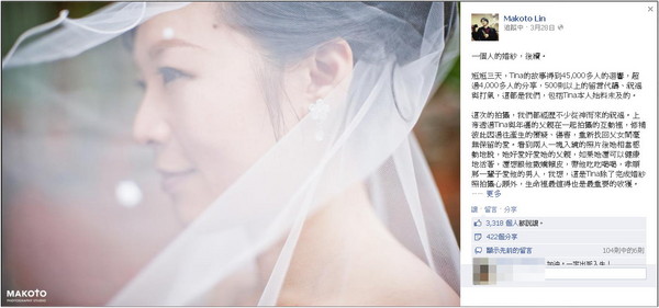▲氣質癌女Tina拍一個人的婚紗,感動許多網友。(圖/翻攝Makoto Lin臉書)