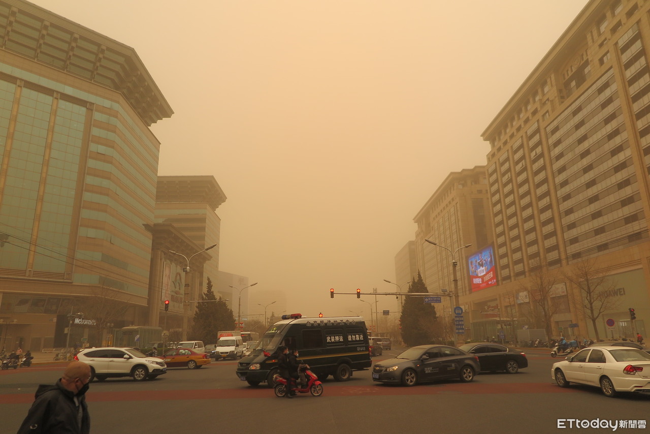 《ETtoday新聞雲》特派員在北京直擊,一早望向窗外黃濛濛一片,讓人以為不小心睡到黃昏,加上刮起大風,上午約10時左右,路上行人無不「包緊緊」,恨不得戴上兩層口罩,阻止沙塵暴的入侵,北京市政府也出動專門的電動吸塵車在接上運作。