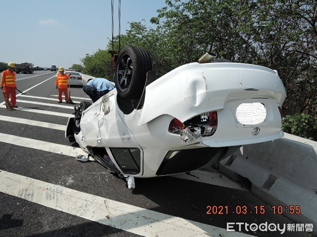 國道警察第四大隊警方指出,3月15日上午10時20分,在國道1號南向295.8公里處(新營至下營間),一部自小客車行駛於上述路段時,疑似變換車道不當,與另一部自小客車發生碰撞,造成變換車道車輛翻覆於最外側車道,幸好事故未影響高速公路車輛通行。