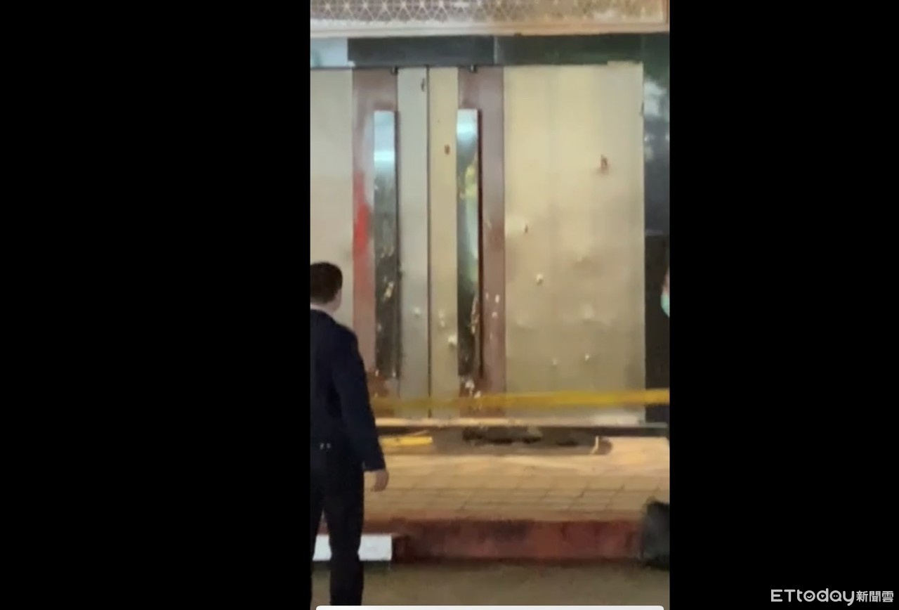 ▲酒店大門遭人丟擲爆裂物,王嫌自行投案聲稱丟「自製爆裂物」。(圖/記者邱中岳翻攝)