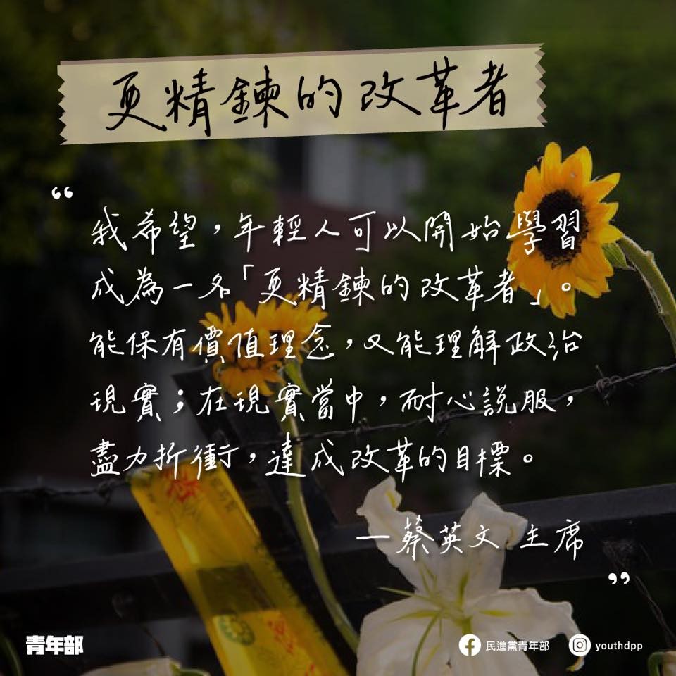 民進黨青年部表示,回顧這七年,從谷底慢慢往上爬的過程中,蔡英文用不同的形式嘗試和各式各樣的年輕人溝通、對話,除了這兩年的「熬民主」、「國務青」、「青年入陣」外,也運用「辣台派開講」等平台,接觸更多年輕人,讓青年世代的聲音發揮影響力。