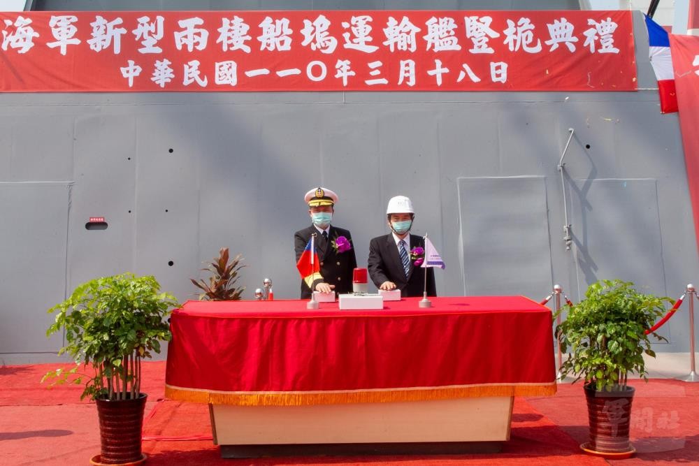 海軍司令部今日於台灣國際造船股份有限公司舉行「新型兩棲船塢運輸艦豎桅典禮」,司令劉志斌上將感謝台船公司在新冠肺炎疫情影響下,仍依計畫節點完成各項工程,未來將如期、如質、如預算完成交艦,落實執行國艦國造政策,籲請國人支持。