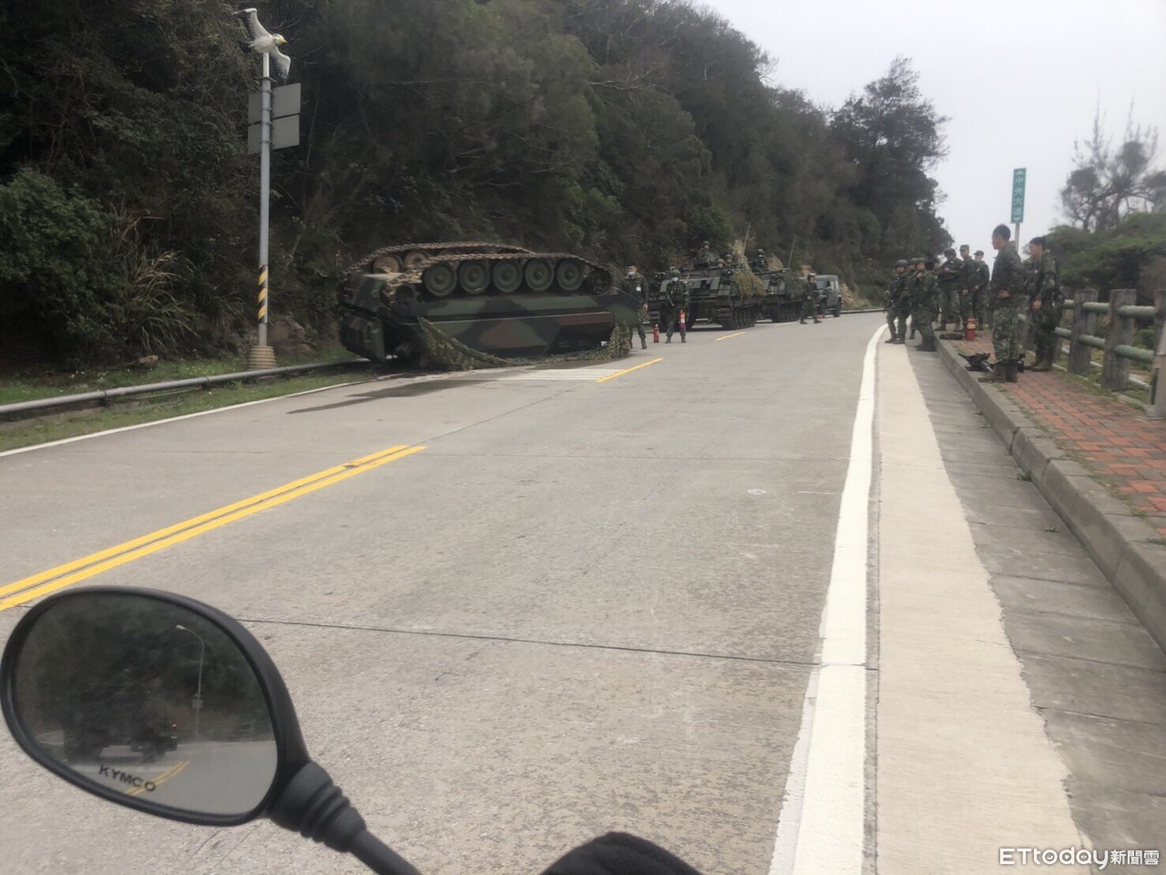 ▲陸軍馬祖防衛部南竿守備大隊18日一台CM-21裝甲車擦撞邊坡未翻覆。(圖/國防部提供)