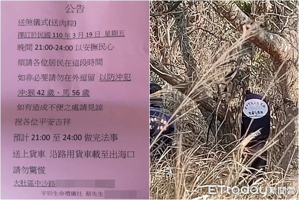 台中市大肚區今晚將有送肉粽(送煞儀式),喪家貼出公告,提醒居民中沙路晚上9點到12點不要在外面逗留,以防沖犯,尤其是屬猴42歲、屬馬56歲者。此外,葬儀社透露,下午還會提前到前陣子在望高寮輕生男子的那棵樹,收集樹枝,一併代為送煞,安定社區人民,呼籲沿路居民非必要不要在外逗留。