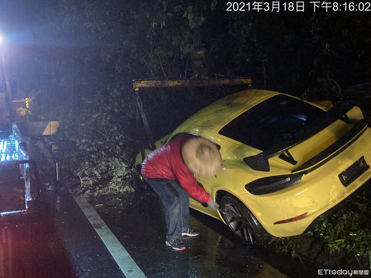 警方調查,35歲的高姓男子昨晚間駕駛保時捷跑車沿著台9線北上,準備北返台北,不料行經事故彎道時,疑似因天空飄起細雨、道路濕滑,車身當場打滑失控、噴往對向南下車道,重重撞上邊坡路樹後才停下,所幸只有車身受損,高男並未受傷,隨後現場也請來吊車協助保時捷脫困。