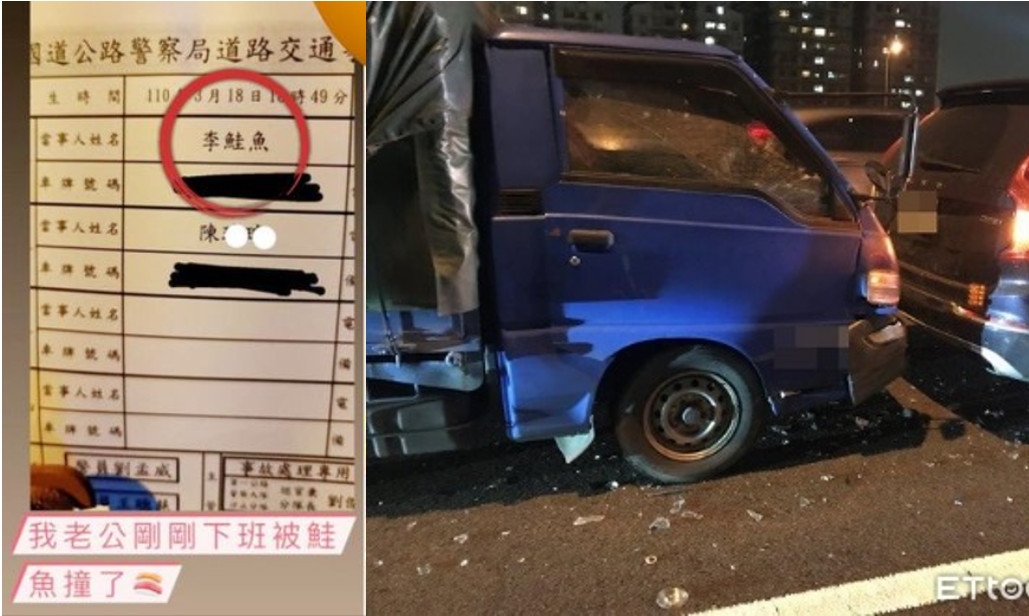 知名迴轉壽司「壽司郎」舉辦優惠活動,引起全台鮭魚之亂,活動兩日總計有305位「鮭魚先生小姐」出現,一名網友張貼交通事故單,表示自己的老公剛剛被「鮭魚」撞了,當事人欄位寫著「李鮭魚」,驚呼鮭魚也有三寶!