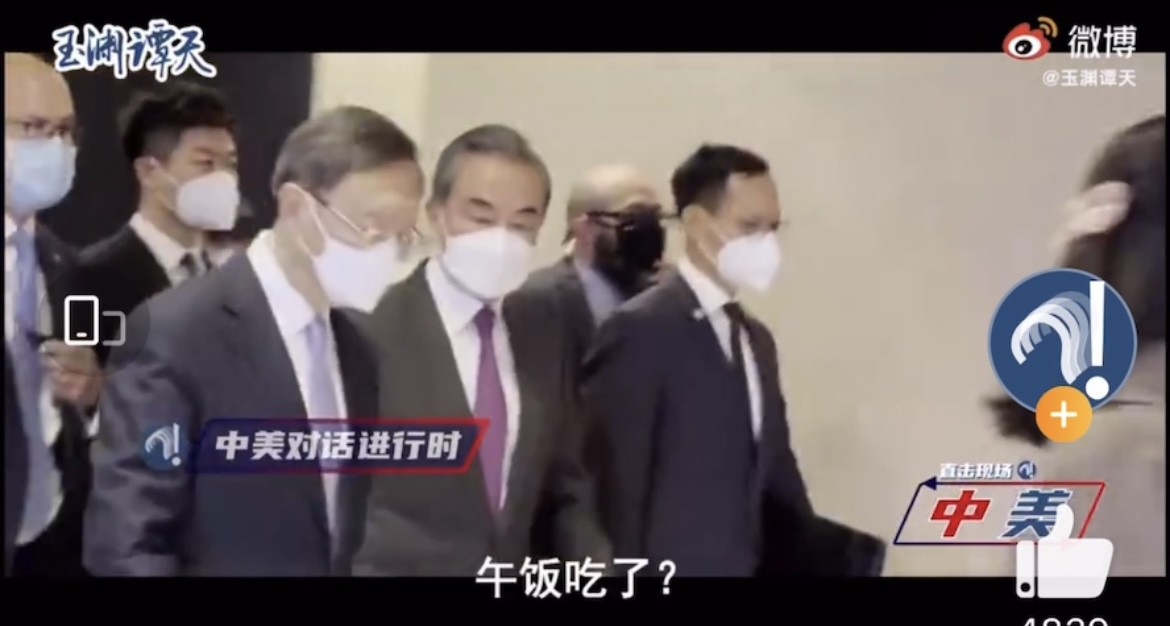 根據《CGTN》釋出的畫面,王毅與楊潔篪各自戴著口罩並肩快步走向會場,當兩人通過走道上的媒體區時,王毅側身問了楊潔篪一句,「午飯吃了沒?」楊潔篪則是邊走邊回答,「嗯,我吃的泡麵。」隨後兩人便在維安人員的保護下進入會場。