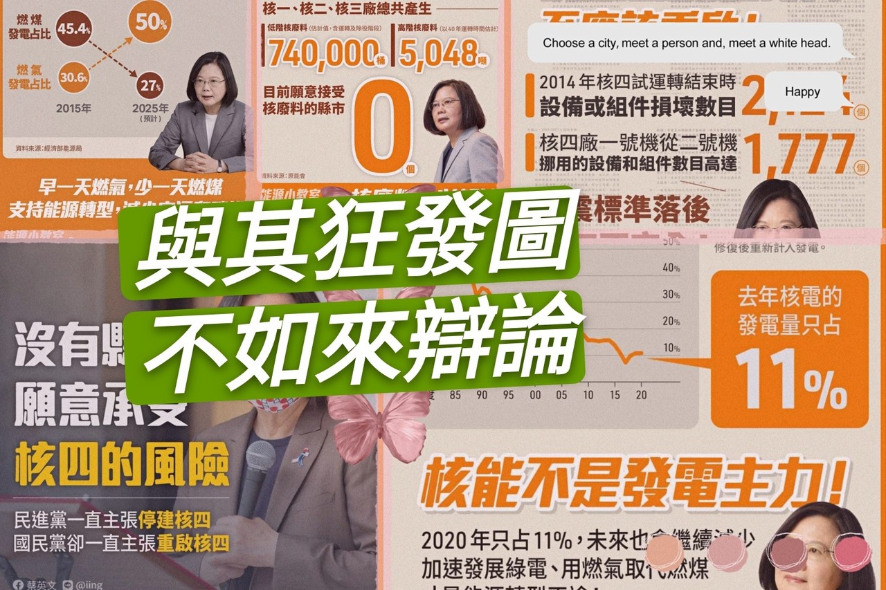 針對核四公投,游淑慧今天在臉書批評蔡英文,就算總統只關心核四議題,但對代表直接民權的公投案,每天用連環泡式的臉書發圖文又是哪招?她認為,其實有個更簡單的方式,那就是正面對決。
