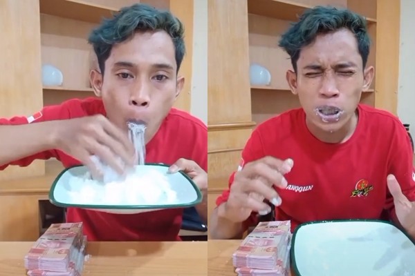 全民網紅時代來臨,為從人群中脫穎而出,只能不斷挑戰自我。印尼網紅安谷(anggun)以吃東西聞名,挑戰的食物無奇不有,牛頭、辣椒、蒜頭都是他爆紅的原因,日前更為了3000萬印尼盾(約新台幣5.9萬元)獎金,一口氣吞下4包鹽,讓網友都忍不住擔心起他的健康。