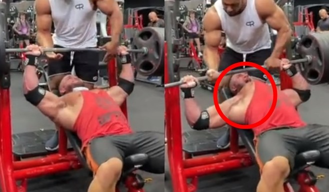 根據影片內容,克勞力身旁有一名教練輔助訓練,進行220公斤的臥推時,突然右側胸肌向中間隆起,讓他大聲哀嚎後從器材上摔落,緊急送醫。