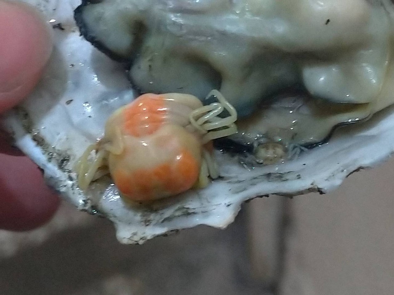 只見殼上的確有兩個外型像蜘蛛又像蟹類的生物,除了有八足外,腹部呈現橘色光澤,讓許多不知情的網友驚呼,「好像異型」、「戰慄時空」、「哇!第一次看到,感覺好吃」、「還有客人說過,蚵仔湯裡怎麼有蜘蛛」。