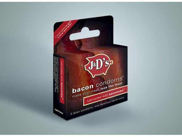 美國有一間食品公司叫做J&D,其實就是創辦人Justin跟Dave的縮寫,這兩位肉食主義者對培根有股莫名的熱愛,除了創業之初開發的培根調味料、培根爆米花,甚至連培根護唇膏都有。Justin跟Dave致力要讓所有的東西都擁有培根香味,所以官方網站斗大的標題就寫著"每樣東西都該擁有培根味!",他們的瘋狂想法,竟然延伸到如此私密的產品,嗯,是培根保險套!