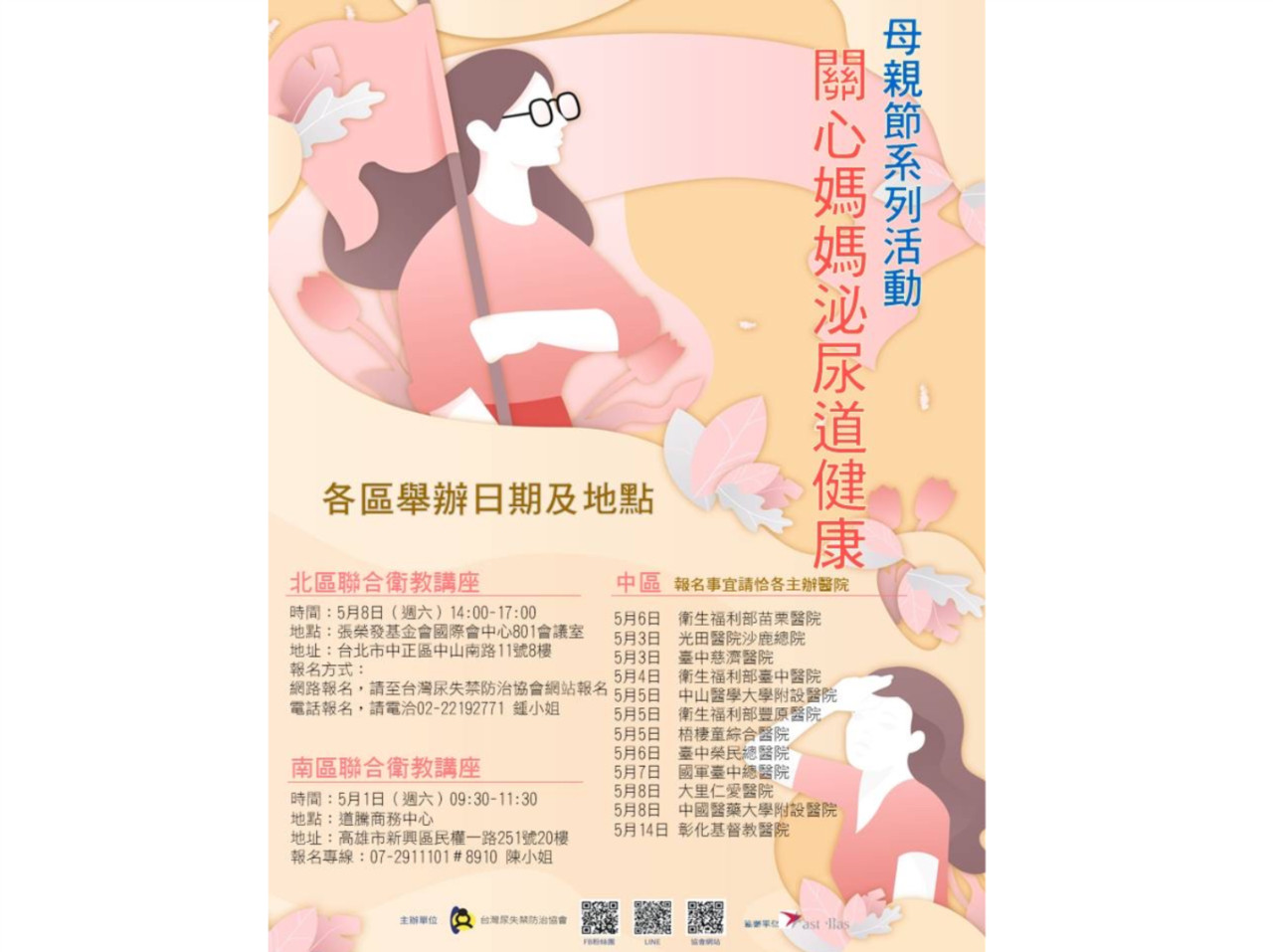 想知道、為什麼身體會變成關不緊、滴滴答答的水龍頭?平日有何預防之道?又該如何取得正確的衛教知識?台灣尿失禁防治協會將在5月8日「母親節」在全國各地舉辦關心婦女泌尿健康衛教講座。
