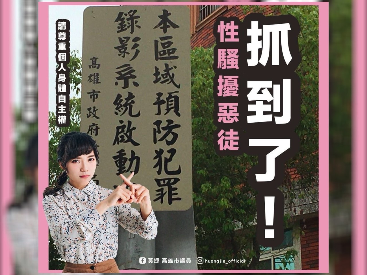 高雄市議員黃捷近期接獲幾位民眾投訴,鳳山出現一位「性騷擾惡徒」,黃捷指出,這名男子在早上六點半和晚上八點左右,不但近身跟蹤捷運站附近的上班女性,還會持續死盯受害人的私密處,甚至還裝作不經意,卻刻意用手肘及肩膀,撞擊女性胸部,受害人還不只一位,接到這樣的訊息後,立刻跟派出所聯絡。
