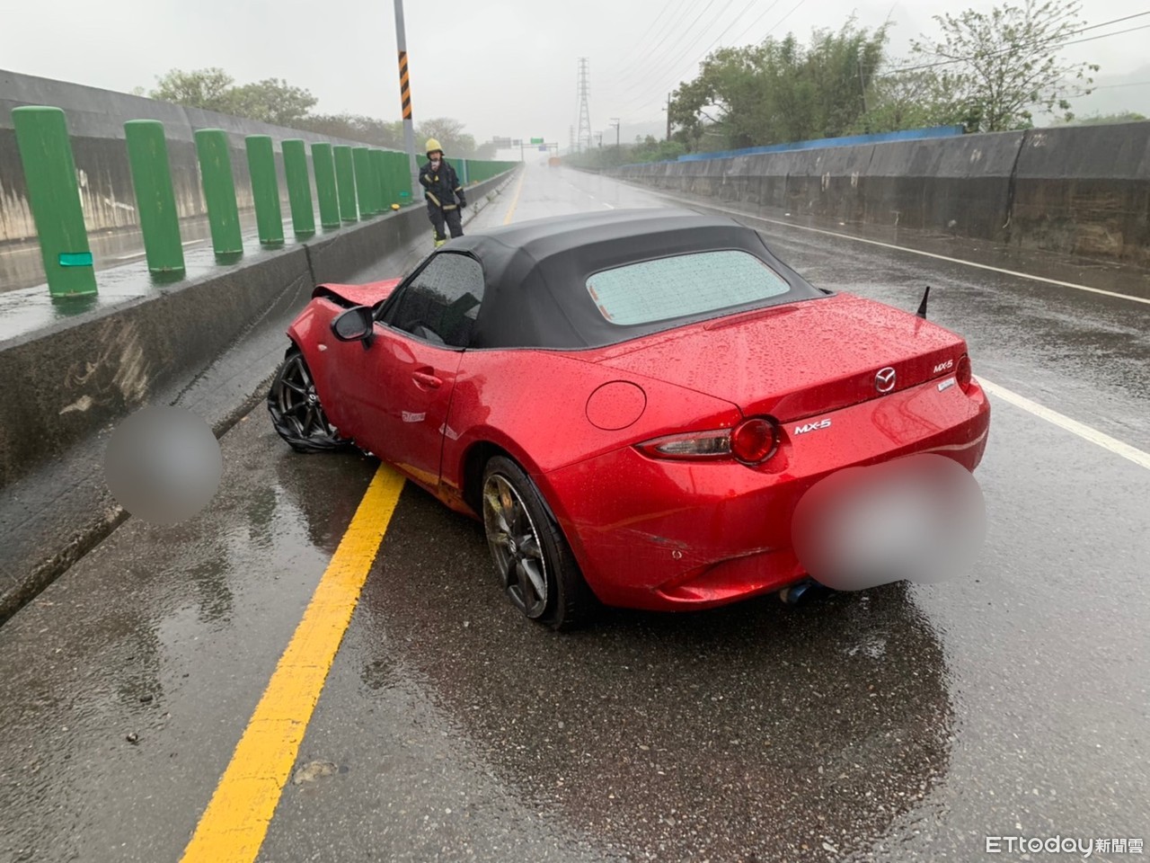 ▲1輛馬自達雙門敞篷車,因天雨路滑不慎失控自撞護欄,造成車頭損毀駕駛受傷送醫。(圖/記者黃孟珍翻攝,下同)