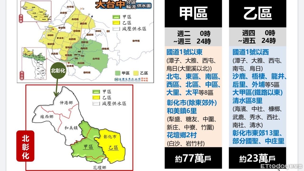 台中市政府經發局說明,為加強相關產業節水力度,自4月1日起自來水用水每月1000度以上工業用水戶由節水11%提升至13%,非工業大用水戶、游泳池、洗車、三溫暖及水療等業者減量供水20%,另考量清明掃墓民眾用水需求,台中、苗栗地區自4月6日由減量供水橙燈轉為分區供水紅燈,考量大管線操作及停復水排氣作業,將以國道1號為分界,分甲乙兩區輪流停水,甲區停週二、三,乙區停週四、五,部分取用地下水區域或科學園區使用專管將不停供,但節水率增至15%。