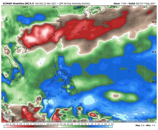 根據歐洲模式(ECMWF)對於未來45日的累積降雨預報,越往紅色系表示相較往年平均的降雨越偏少,反之偏藍色系則表示越多。可以看到未來45天中國華南到台灣一帶是明顯偏乾、少雨,而在菲律賓到與中國長江一帶則是雨水偏多。