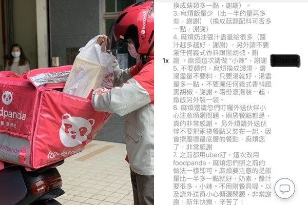 客人的要求實在很繁瑣,像是飯量少但要比一半再多一些、菇類配料要多一點、奶油醬汁給很多、不要義式香料和黑胡椒、把麵包換濃湯但只要湯不要料等;除了向店家提出要求以外,他還不忘提醒外送員一定要注意餐點、別弄翻了,「不要把兩袋餐點又裝在一起,因會擠壓壞最底層的餐點。」