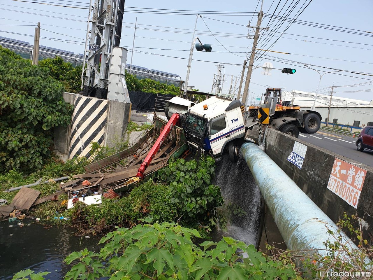 由於兩台車子體積都很龐大,擦撞後產生很大撞擊力,其中半聯結車「頭上尾下」卡在溝旁斜坡,大貨車車頭則與貨斗呈現90度彎折,車頭並懸空卡在自來水幹管上,造成漏水。