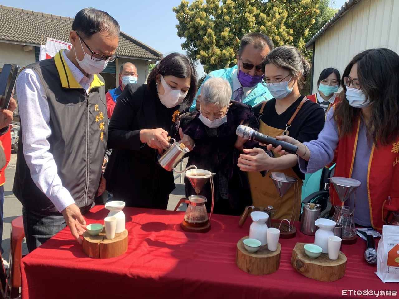 ▲雲林縣長張麗善握著樹火阿嬤的手,藉由溫水一圈一圈緩慢地注入,沖泡出專屬阿嬤的咖啡香氣。(圖/記者蔡佩旻攝)