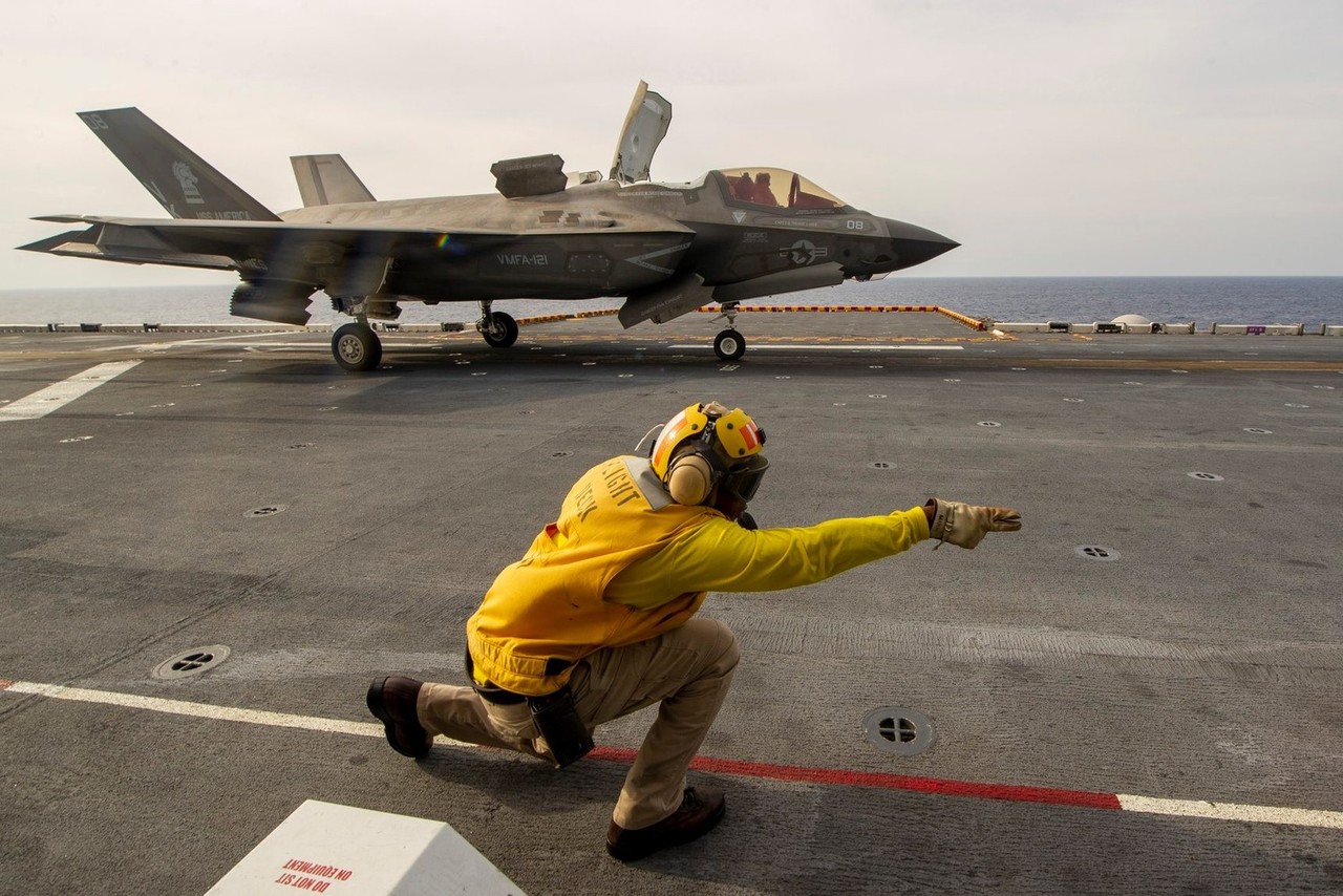 ▲美國海軍陸戰隊裝備F-35B閃電II戰鬥機,在美國級兩棲攻擊艦上進行訓練,攝於2019年10月8日(示意圖/美國海軍, US Navy photo)