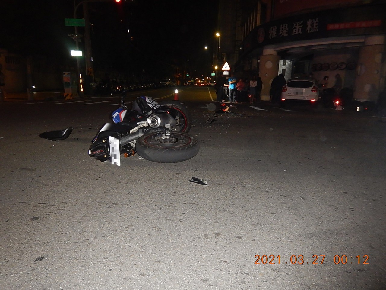 警方表示,小鋼砲駕駛陳女沿東明路由西往東方行駛,騎乘「仿賽車」機車的謝姓男子沿益民路二段由北往南方向行駛,兩車在十字路口交叉撞,騎士安全帽、鞋子和機車碎片散落一地,小鋼砲被撞後,又衝進騎樓撞倒停放的8輛機車。