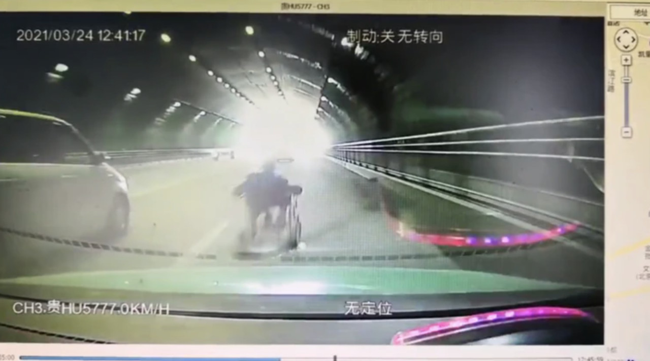 貴州一名汽車駕駛日前在隧道中駕駛,突然發現道路上有一名坐著電動輪椅的老人,嚇得馬上閃躲,但由於剎車不及,仍將老人從輪椅上撞飛,導致老人當場身亡。