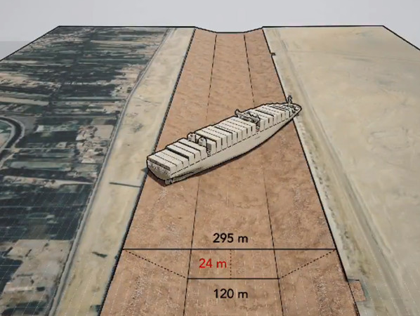 此動畫讓人更清楚看見,貨輪當時偏離正常航向,船艏船尾插入河岸、動彈不得的情況。畫面中,運河航道表面寬度大約295公尺,水深僅24公尺,而底部寬度120公尺,呈現「倒立」的梯形形狀。但長賜號全長400公尺,船體因故偏斜打橫後,幾乎堵住整條通道。