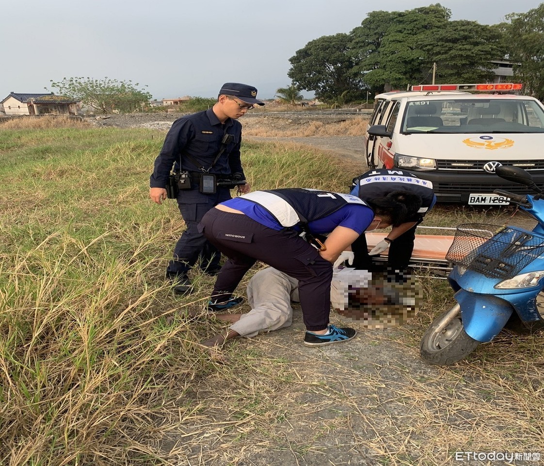 蕭姓男子因長時間在烈陽下工作,被日曬倒在田間草叢,枋寮警分局員警巡邏經過發現一台倒在草叢邊的機車,基於職業敏感上前查看,發現了他,聯絡救車將他送醫治療,讓家屬很感激。