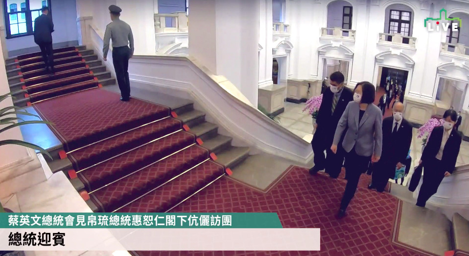 總統蔡英文30日在總統府內接見帛琉總統惠恕仁(Surangel Whipps Jr.)時,府方首次啟動「直播新玩具」,共架設多達5個直播鏡頭,捕捉蔡英文從門口開始接待惠恕仁一路走過敞廳、轉進晴廳的行徑路線。這次雖然不屬國是訪問規格,但府方確實首次嘗試高規格的直播模式。